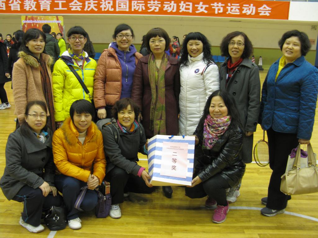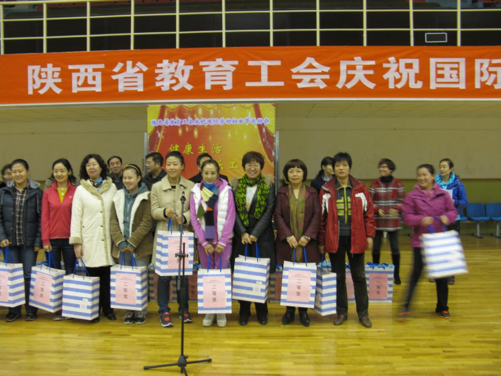 从3月5日下午结束的陕西省教育工会庆祝国际劳动妇女节运动会上传来喜讯,我院女教职工代表队夺得运动会二等奖,院工会主席刘文青代表学院上台领奖。 健康生活、快乐工作——由陕西省教育工会女教职工委员会和西安邮电大学工会共同承办的陕西省教育工会庆祝国际劳动妇女节运动会于3月5日下午在西安邮电大学长安校区体育馆举行,比赛设跳小绳、投掷乒乓球、托球跑、三人四足接力跑四个项目,参赛选手为省内高校的女教职工代表。比赛以省教育工会划分的片区分组,以《运动会秩序册》名单顺序逐项进行。比赛中每队10人,各队设1名领队和9名运动员。最终,来自省内49所高校的女教职工代表队按照团体总分评出一等奖16名,二等奖16名,优秀奖17名。