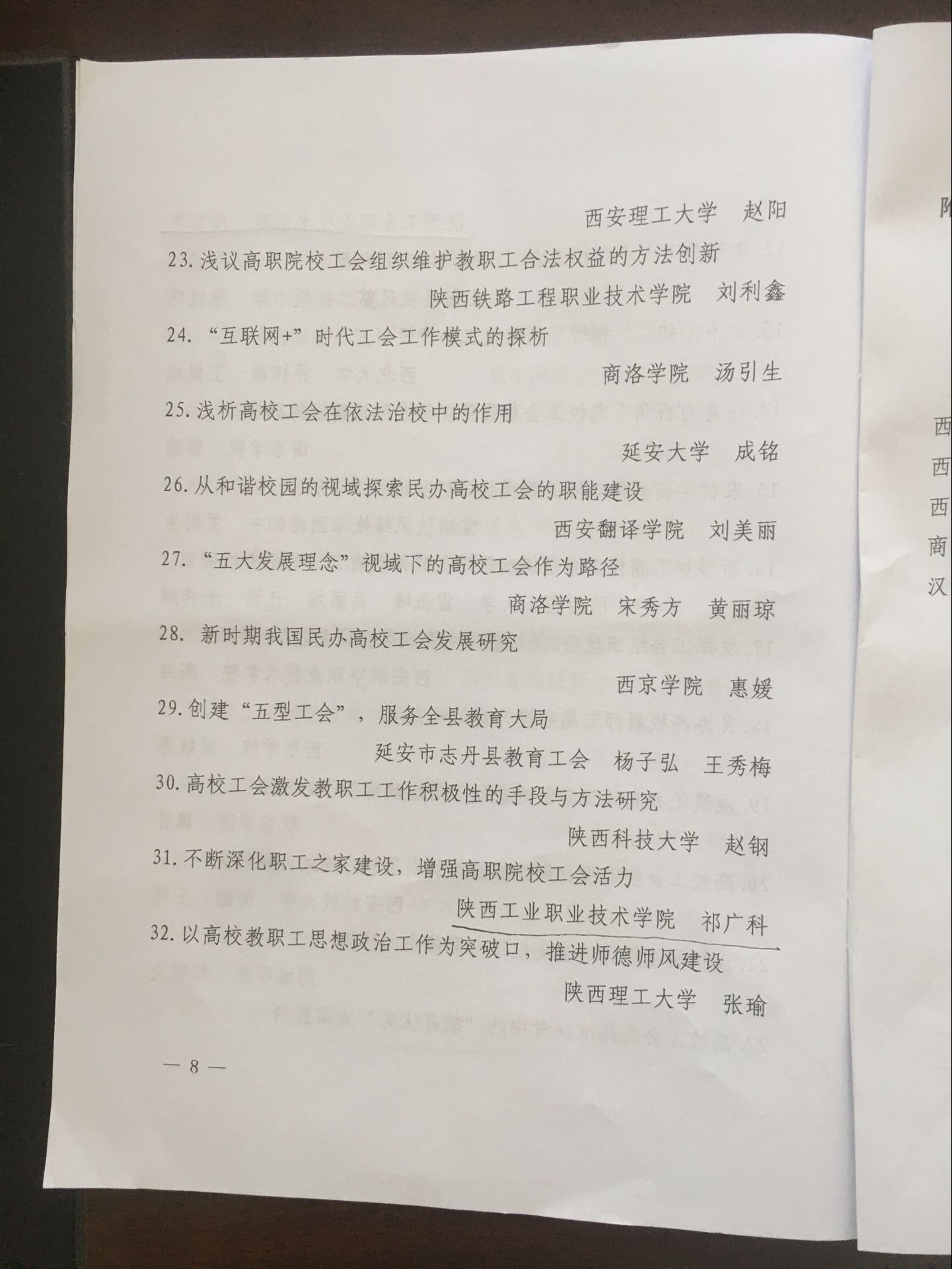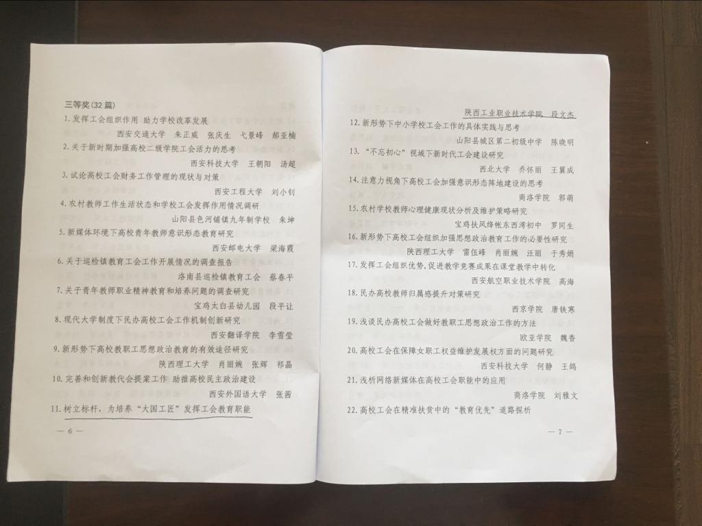 七年来,院工会持续加大工运理论研究工作的支持力度,成立并依托陕西工院工运理论研究会,广泛动员,大力号召工会委员、分会主席和委员、乃至普通会员积极投身工运理论研究工作。学院工会每年组织工会委员构成的评审团从课题或论文选题、调研成果和论文撰写、框架结构设计、乃至格式等方面全程指导、全面支持。2017年在全院范围内遴选出5篇工运理论研究成果上报省教科文卫体工会参评,最终3篇获奖。工会主席、统战部长刘文青撰写的工会调查报告连续七年荣获省教科文卫体工会优秀理论调研成果奖,此次撰写的《立德树人视域下高职院校工会职能的路径探析》获评一等奖,同时获2017年度全省工会优秀调研成果评选三等奖,为全省高职院校工会工作提供了经验和借鉴。段文杰撰写的《树立标杆,为培养“大国工匠”发挥工会教育职能》,祁广科撰写的《不断深化职工之家建设,增强高职院校工会活力》,角度各异,对工会工作有较强指导意义,同获优秀调研成果三等奖。我院工运理论研究成果丰硕既是学院党政对工会工作支持的体现,又是广大专兼职工会干部和会员团结奋进的结果,学院工会将以此为契机,发挥自身优势,顺应新形势,开拓新资源,推进我院工运理论研究工作继续向前迈进,为学院的改革发展做出更大贡献。