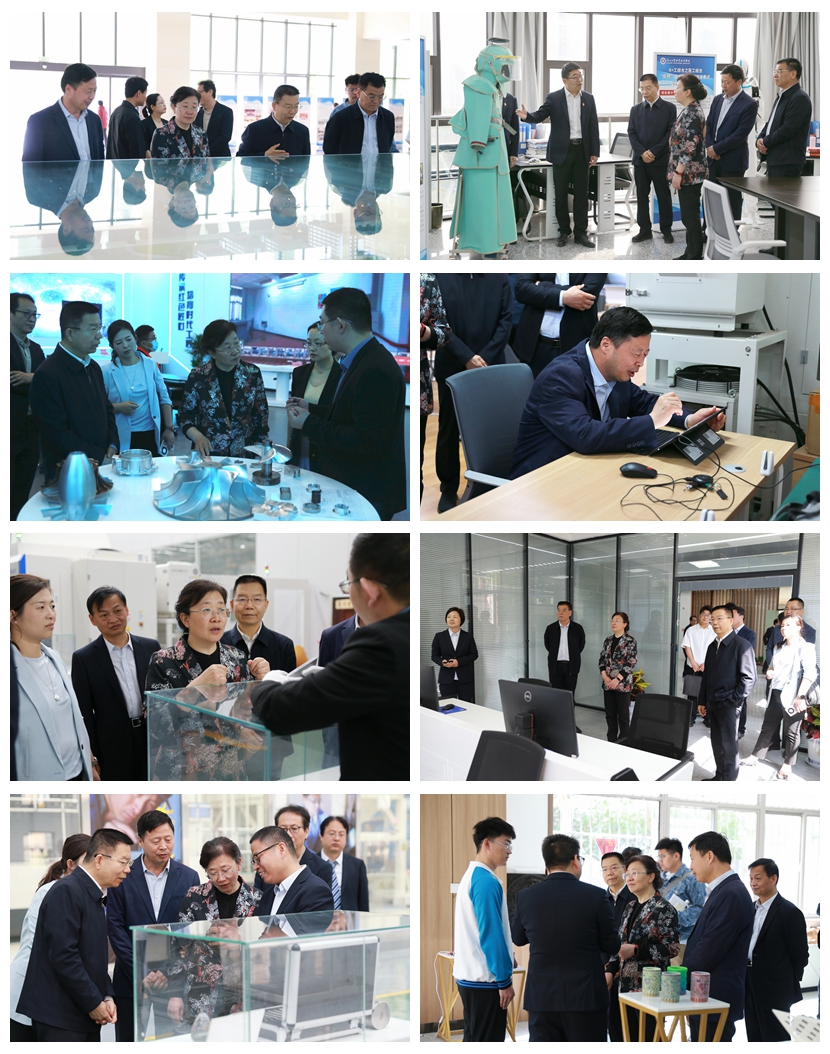 在参观陕西省劳模、工匠职工创新工作室-梁晓哲智能制造创新工作室时,高洁主席对我校职工创新开展“N工结合”项目以及学校在服务地方经济取得的成绩予以高度肯定。高洁主席鼓励青年教师发挥特长、融合学科、创新发展;在参观我校机械工程学院智能制造协同创新中心、我校与北京精雕成立的产业学院时,高洁主席表示,学校在校企共同育人,专业交叉融合,将教育和产业相结合,为培养更多高素质的产业工人提供了很好的经验与做法。