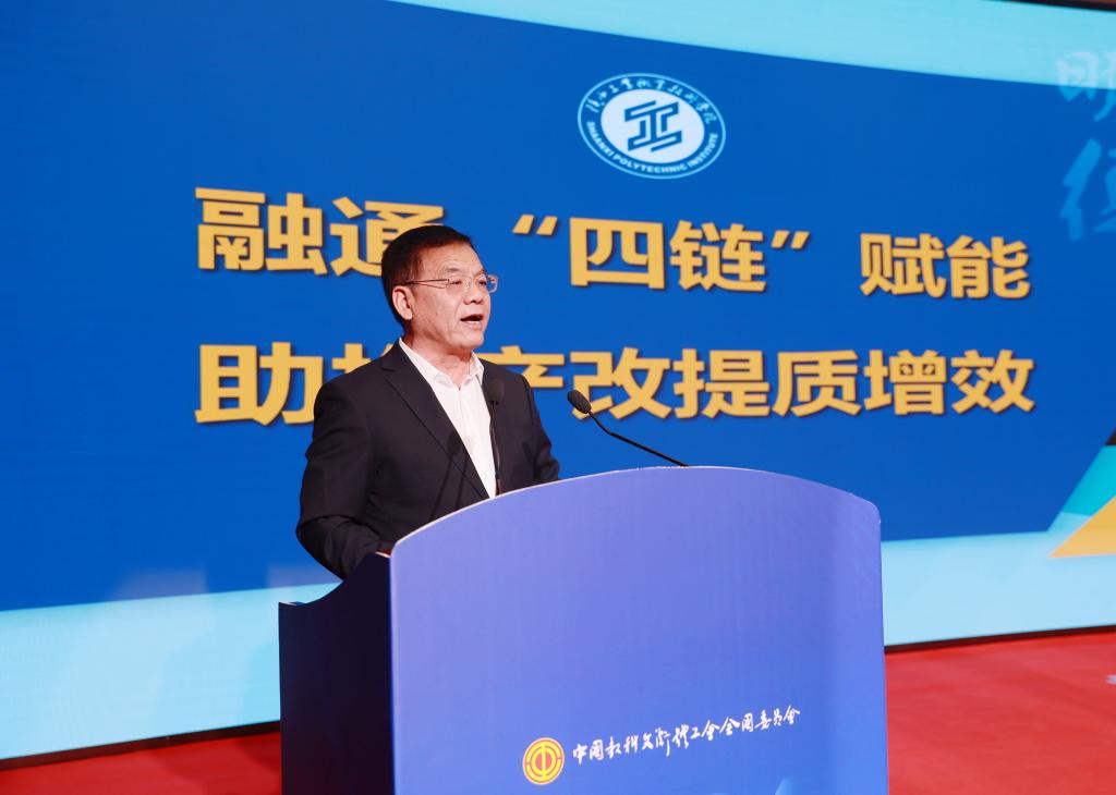党委书记惠朝阳在致辞中表示,职业院校是建设高素质产业工人队伍、助推产改的核心要素。近年来,陕西工业职业技术学院以“产改”试点单位建设为抓手,坚持“产教融合、校企合作、育训并举”,聚焦产教融合过程中产业与教育、学校与企业、育人与培训等难题,从“专项研究”赋能、“产业学院”驱动、“工匠学院”牵引等方面发力,探索了高职院校以工会组织为纽带引领产改的新路径,走出了一条具有陕工特色和装备制造业特质的职业教育集团化办学发展之路。今后,学校将继续以党建带工建为抓手,以产教深度融合为主线,探索创新学校工会在新时代促进经济社会发展与技能人才培养的新模式、新路径,形成“产改”工作陕工方案与经验,为建设制造强国、实现中国式现代化培养造就更多大国工匠和能工巧匠!